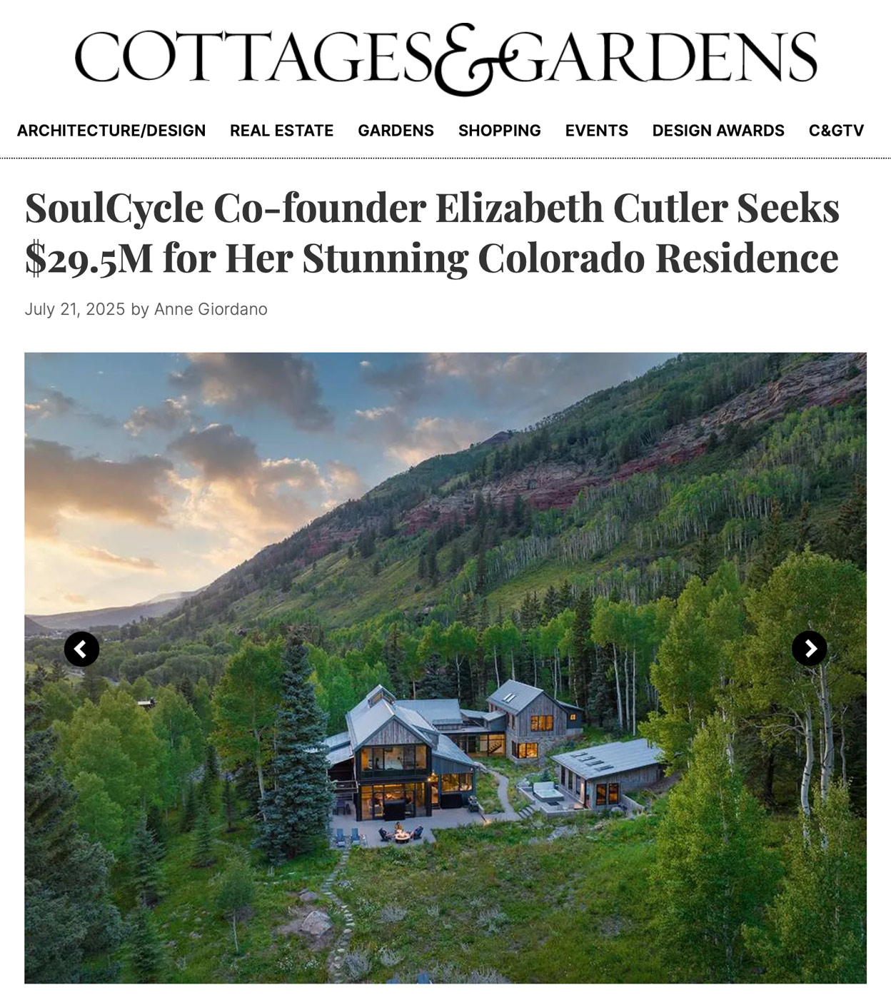 “Tucked in a picturesque valley of Telluride, a majestic yet modern estate where contemporary architecture and rugged natural scenery abound has hit the market. It seems like the ultimate Colorado retreat and will come turn-key, fully furnished (even including e-bikes, per the NY Post).” View Cottages & Gardens article >