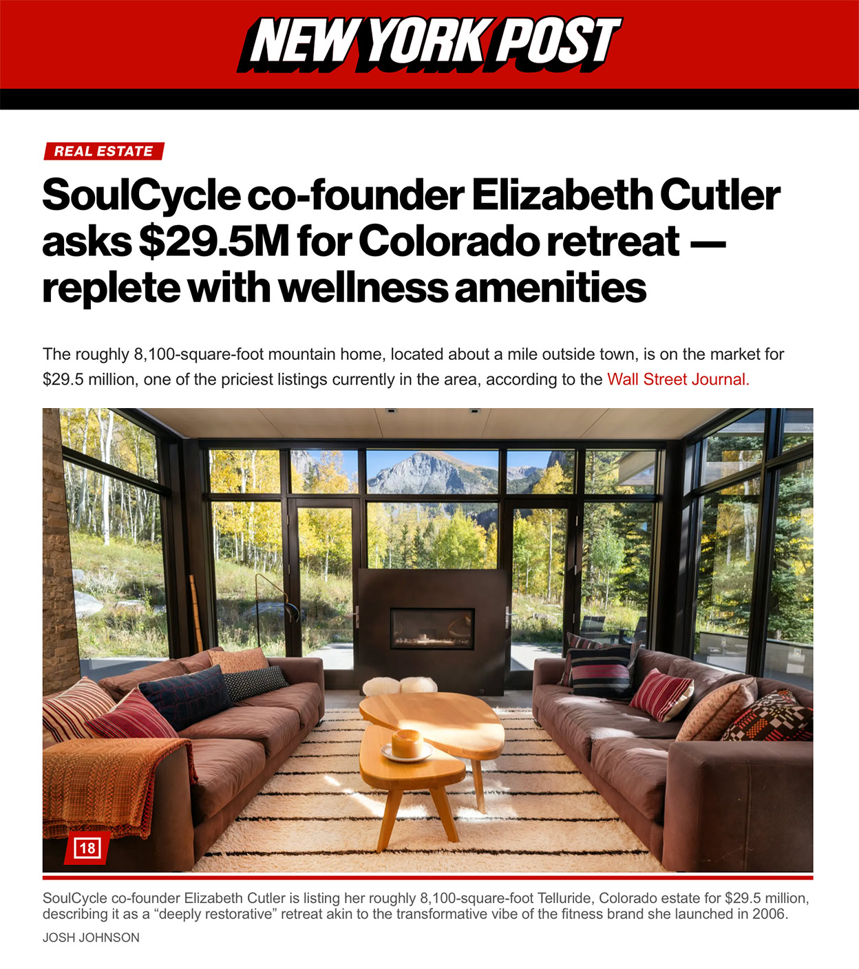 “This home is ready for its next owner to take it for a spin. Elizabeth Cutler, co-founder of the famed indoor cycling company SoulCycle, is looking to part ways with her longtime Colorado getaway — a secluded estate near Telluride that she describes as “deeply restorative, deeply relaxing.'” View New York Post article >
